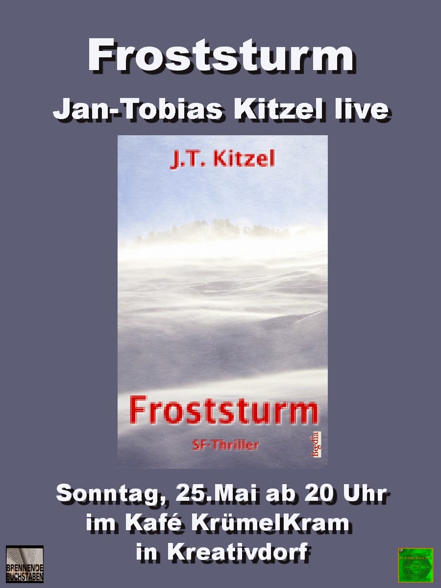 JT: Nachdem ich bei den beiden letzten Lesungen (online wie offline) aus meiner Kurzgeschichtensammlung „Frostzeit“ gelesen habe, werde ich diesmal aus aus meinem Roman „Froststurm“ (2013 im Begedia-Verlag erschienen) vorlesen. Wie man sich anhand der Titel denken kann, hängen beide Werke etwas zusammen: „Frostzeit“ ist eine Kurzgeschichtensammlung, die unter anderem Nebencharaktere und Nebenstränge aus „Froststurm“ aufgreift und zu eigenen Geschichten ausbaut. Wer also „Froststurm“ kennt, wird das ein oder andere in „Frostzeit“ wiedererkennen. Allerdings steht beide Werke unabhängig voneinander, man muss weder den Roman kennen um die Kurzgeschichten zu verstehen, noch umgekehrt.