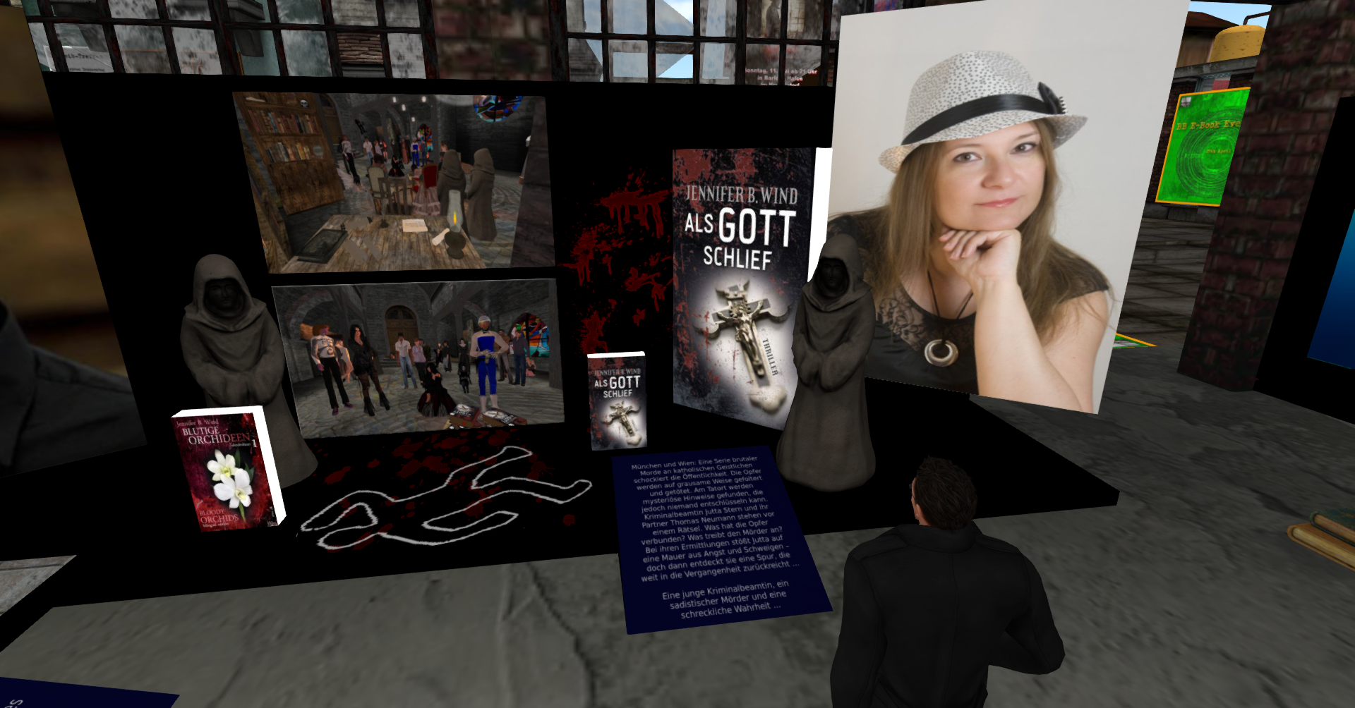 JBW: Ich lese aus meinem Thriller „Als Gott schlief“ der am 25. April 2014 erschienen ist, und aus meinem zweisprachigen Serial „Blutige Orchideen – Bloody Orchids“, das dieser Tage in deutscher und englischer Sprache erscheinen wird. Da ich schon einige Lesungen hinter mir habe, unter anderem in großen Theatern, und eben auch meine erste Second Life Lesung schon erfolgreich absolviert habe, hält sich das Lampenfieber in Grenzen. Wovor ich allerdings immer Angst habe ist, dass niemand kommt 😉 *lach* auch bei den Real Life Lesungen ist meine größte Panik immer die, alleine dort zu stehen oder nur mit einer Handvoll Leute. Aber ansonsten bin ich immer sehr gut vorbereitet und gebe immer mein Bestes, egal wie es mir gerade geht. Ich freue mich schon sehr auf den Event und werde zweimal die Woche abends an meinem Stand stehen und freue mich auf jeden, der vorbei kommt.
