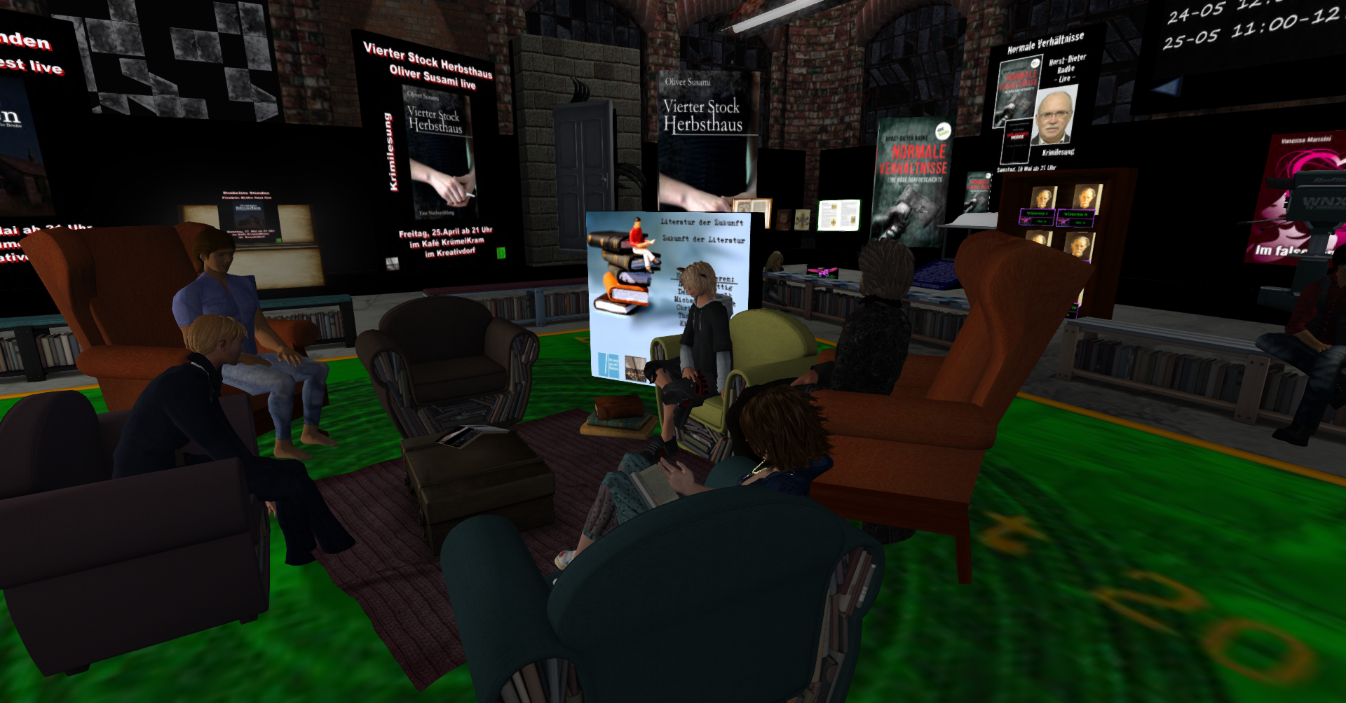Gäste der Diskusion waren Dennis Schmolk, einen der Macher von „Alles fliesst“, Self Publisher Michael Meisheit und Christoph Burstup Weiss der unter anderem für den ORF einige Artikel über SecondLife geschrieben hat. Leander Wattig war leider verhindert, aber auch so kam eine interessante Diskussionsrunde über das Thema Self Publishing zustande. Da man schon in SL war, wurden natürlich auch die Möglichkeiten dieses Themas eingeflochten.