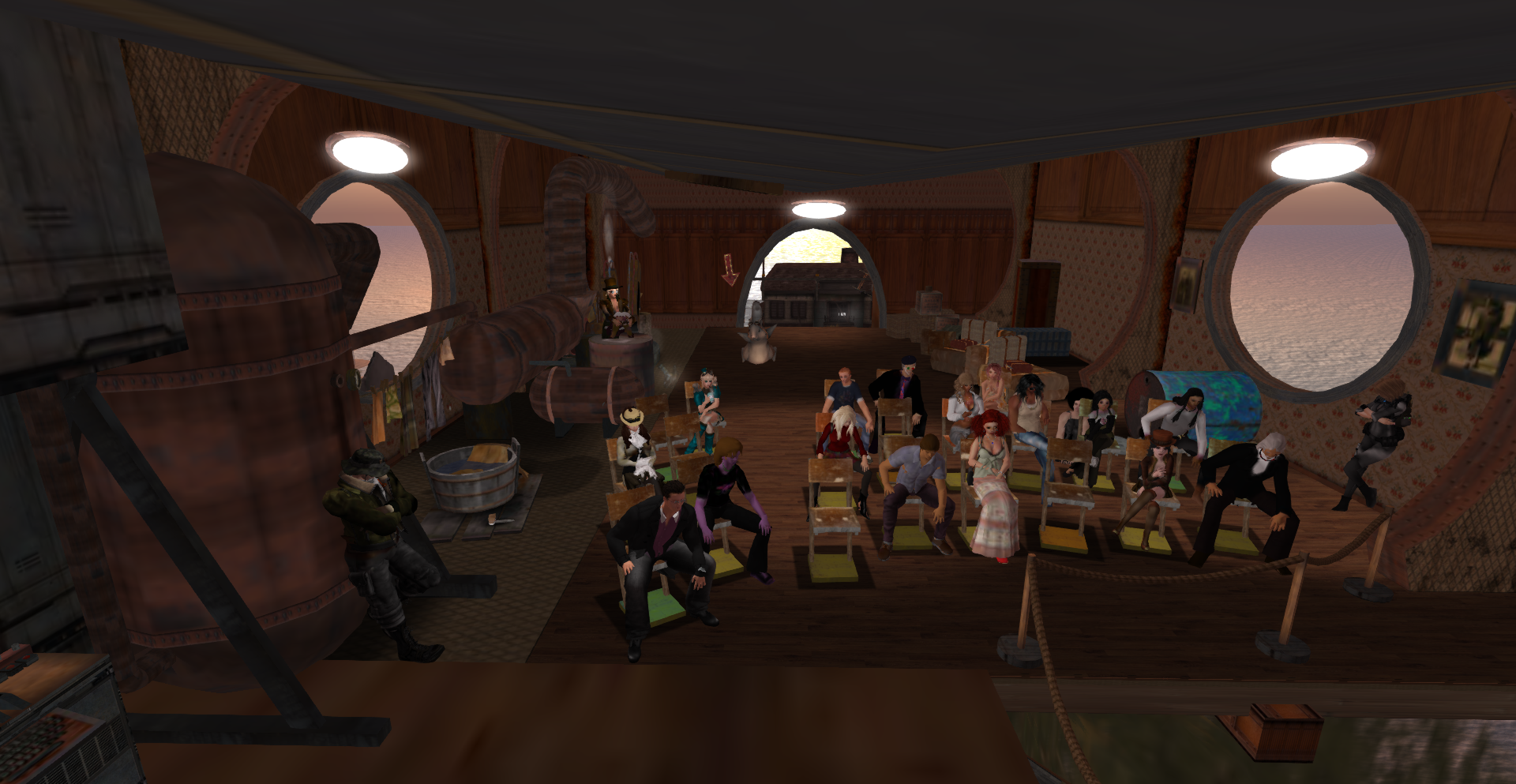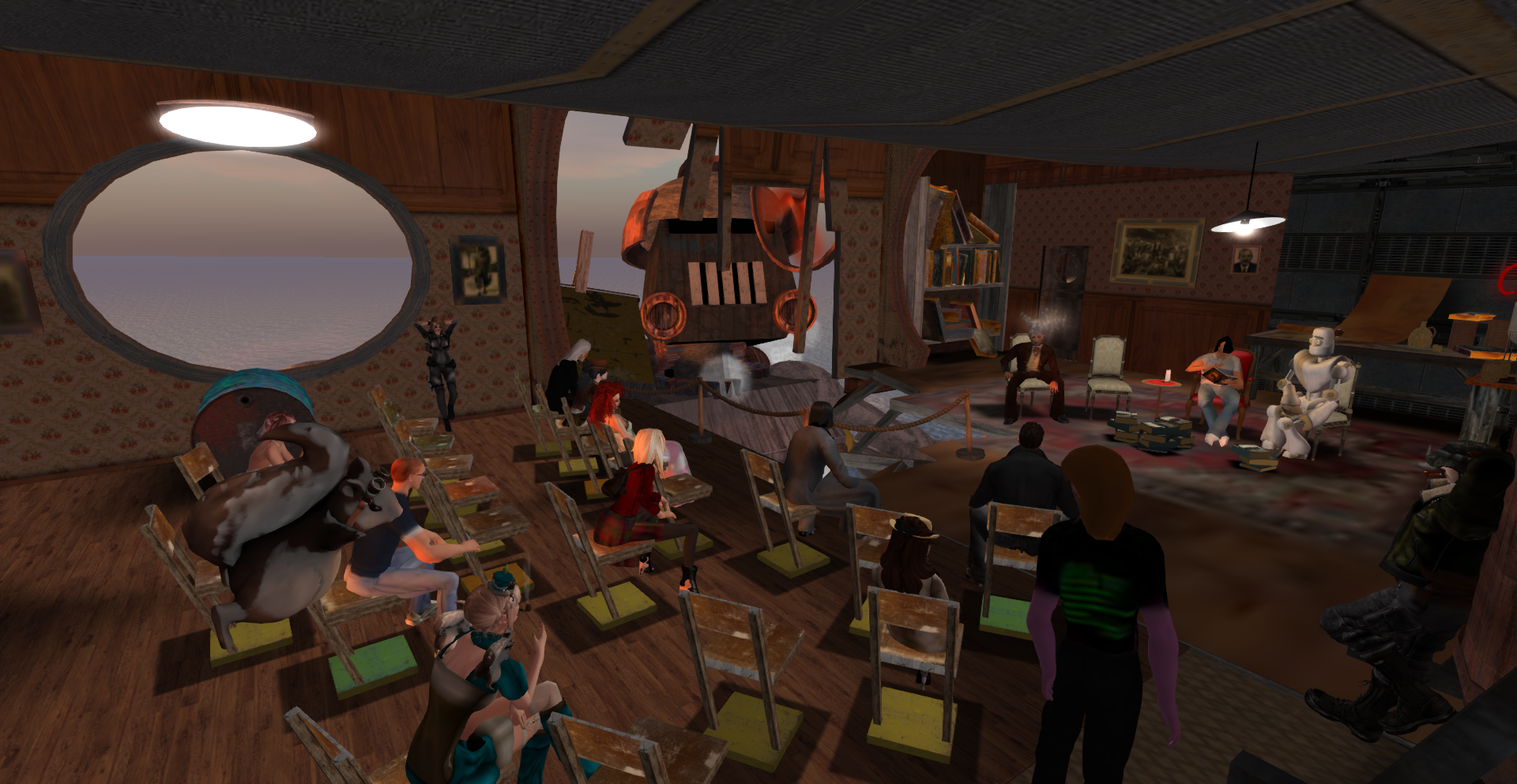 Wie immer in spektakulärer Kulisse von Barlok Barbosa, extra passend zu den Lesungen gestaltet. Und wie immer freut man sich über Besucher auf den SL-Lesungen, auch wenn sie 25 Meter groß sind und Beulen ins Luftschiff machen.