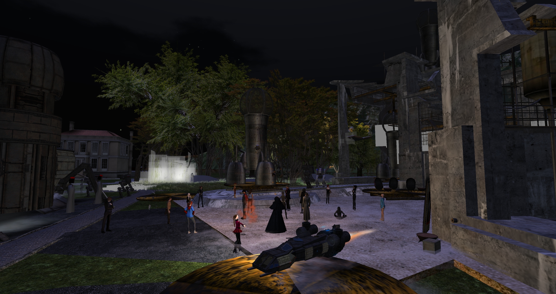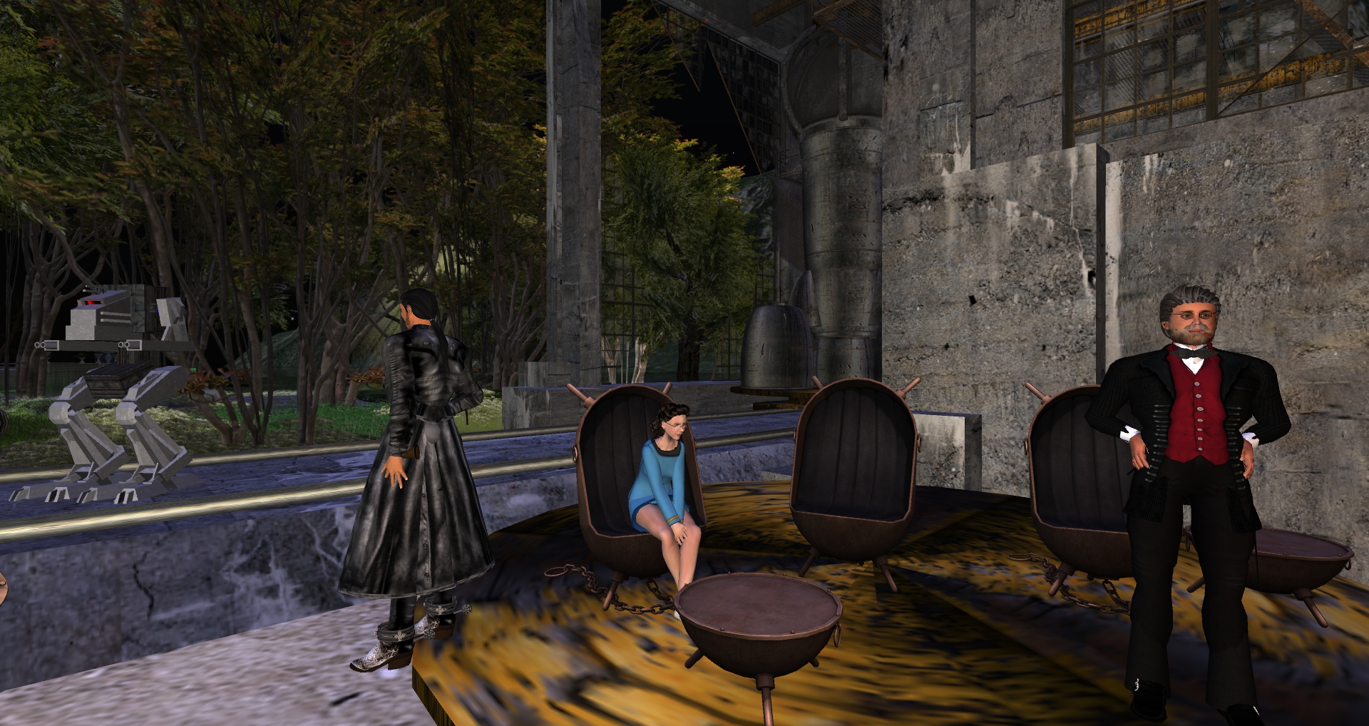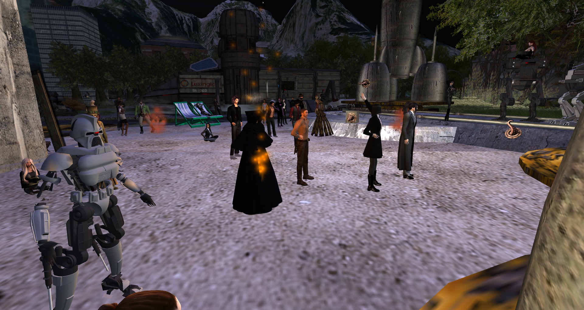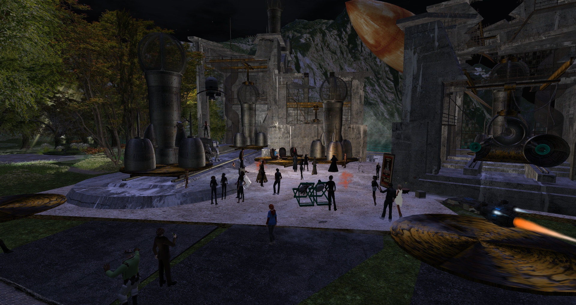 Nach leichten Anlaufschwierigkeiten war dann schnell klar: Das Warten hat sich gelohnt! Eine unglaubliche Bühnenpräsenz, die noch von einen Soundtrackt unterstützt wurde. Tom Daut las in einer Kulisse, die fast eine gesamte SIM umfasste und von Barlok Barbosa und ClaireDiLuna Chevalier gemeinsam gestaltet wurde. Der gelesene Teil aus „Die Sinistra“ war eher Richtung harter Military SF, aber der Roman geht, nach dem Autor, dann mehr in Richtung einer Mischung aus Dark Fantasy und Military SF.