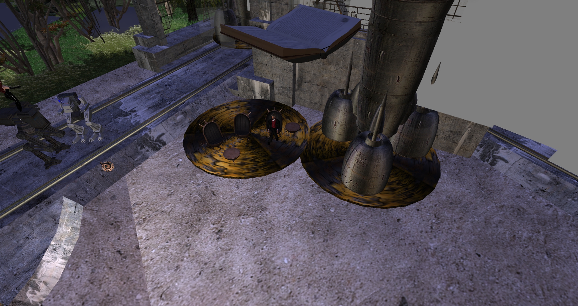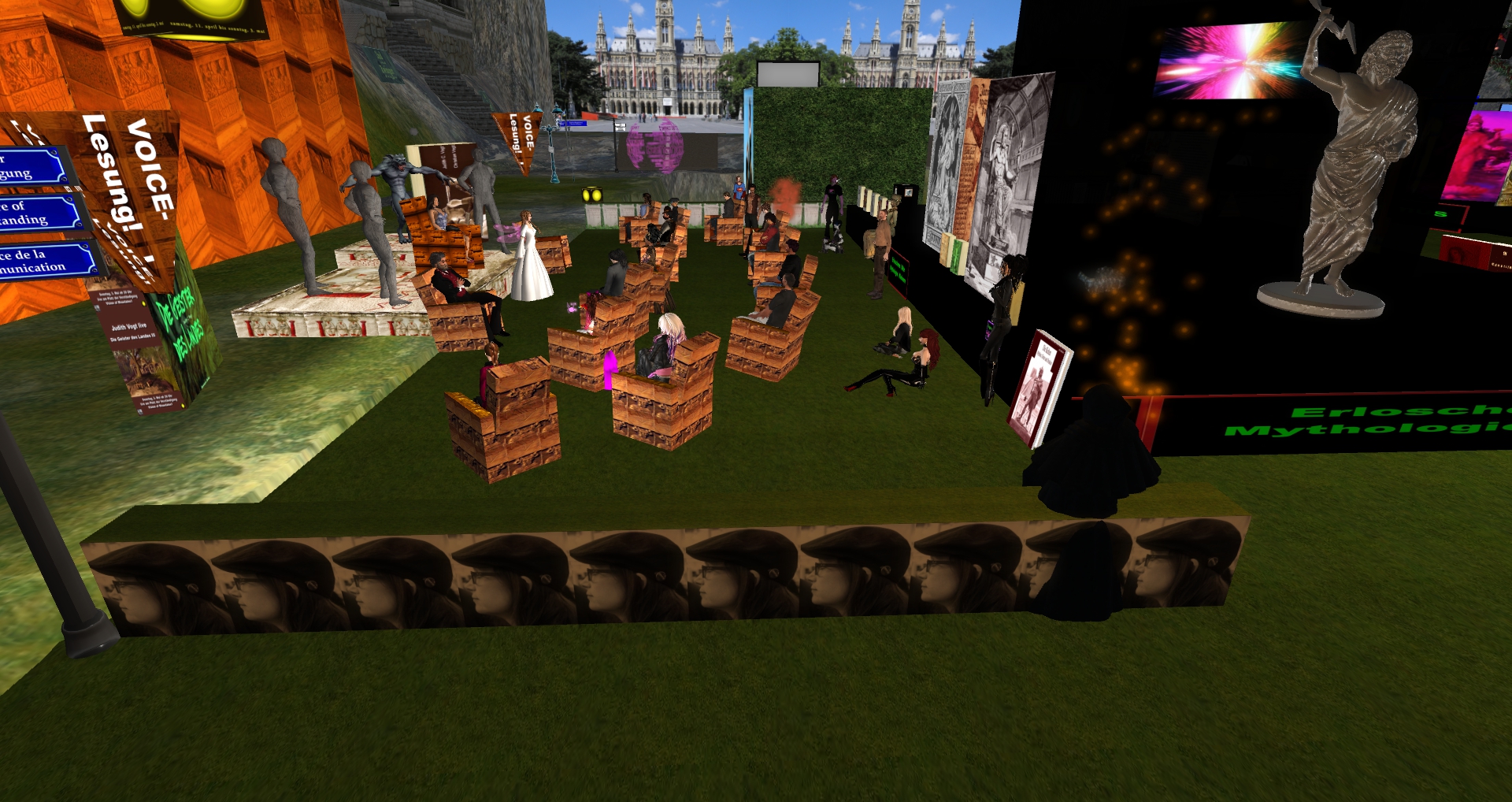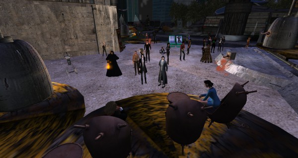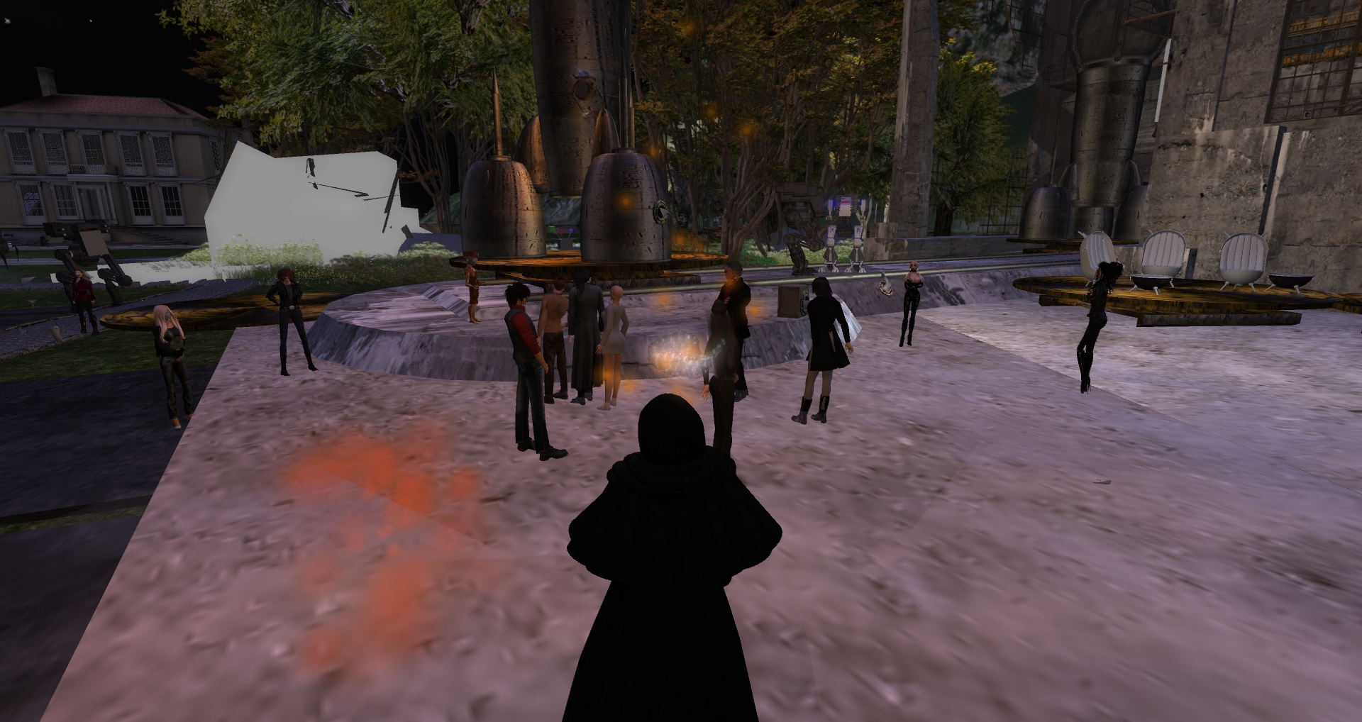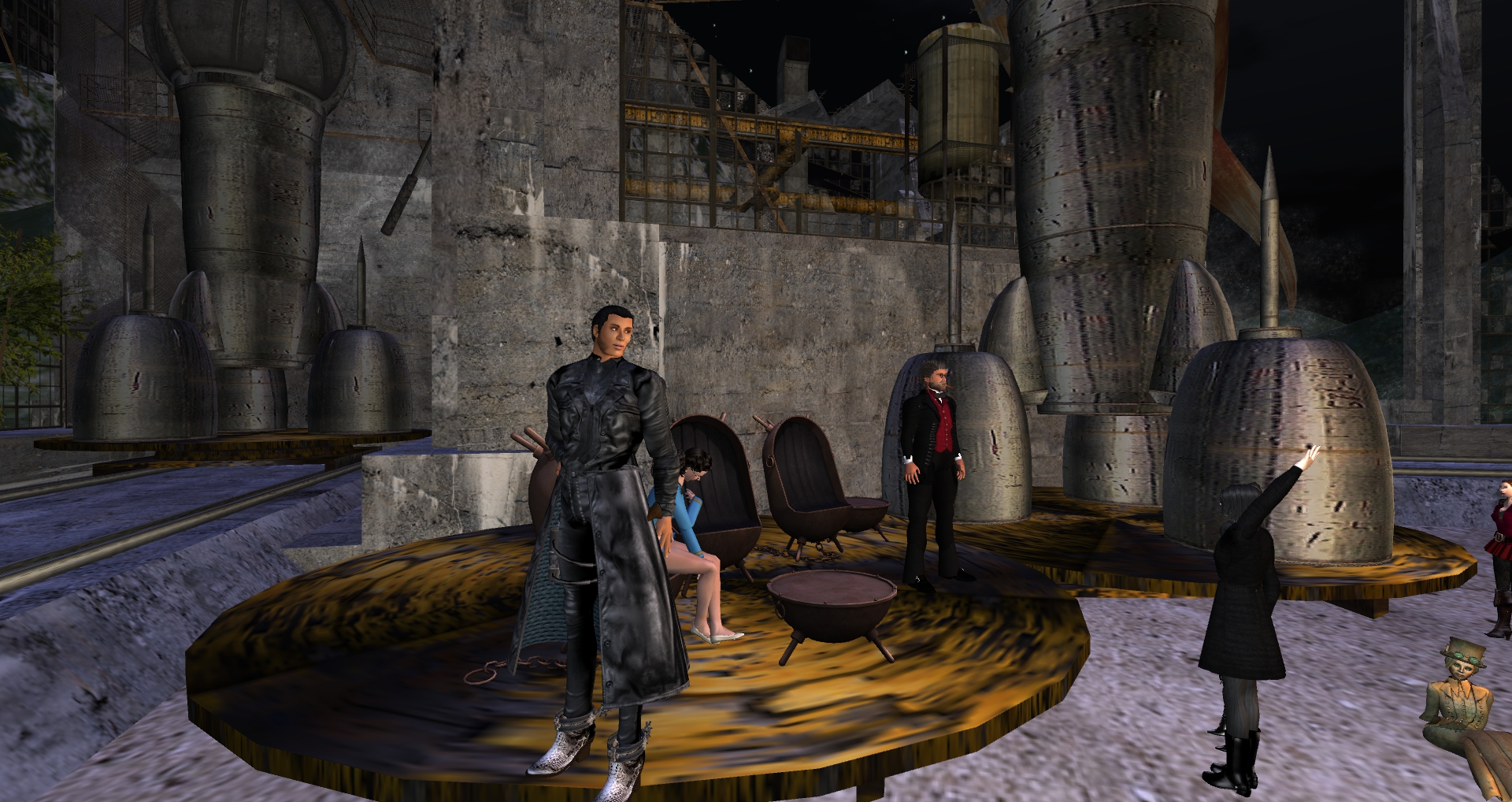 Nach leichten Anlaufschwierigkeiten war dann schnell klar: Das Warten hat sich gelohnt! Eine unglaubliche Bühnenpräsenz, die noch von einen Soundtrackt unterstützt wurde. Tom Daut las in einer Kulisse, die fast eine gesamte SIM umfasste und von Barlok Barbosa und ClaireDiLuna Chevalier gemeinsam gestaltet wurde. Der gelesene Teil aus „Die Sinistra“ war eher Richtung harter Military SF, aber der Roman geht, nach dem Autor, dann mehr in Richtung einer Mischung aus Dark Fantasy und Military SF.