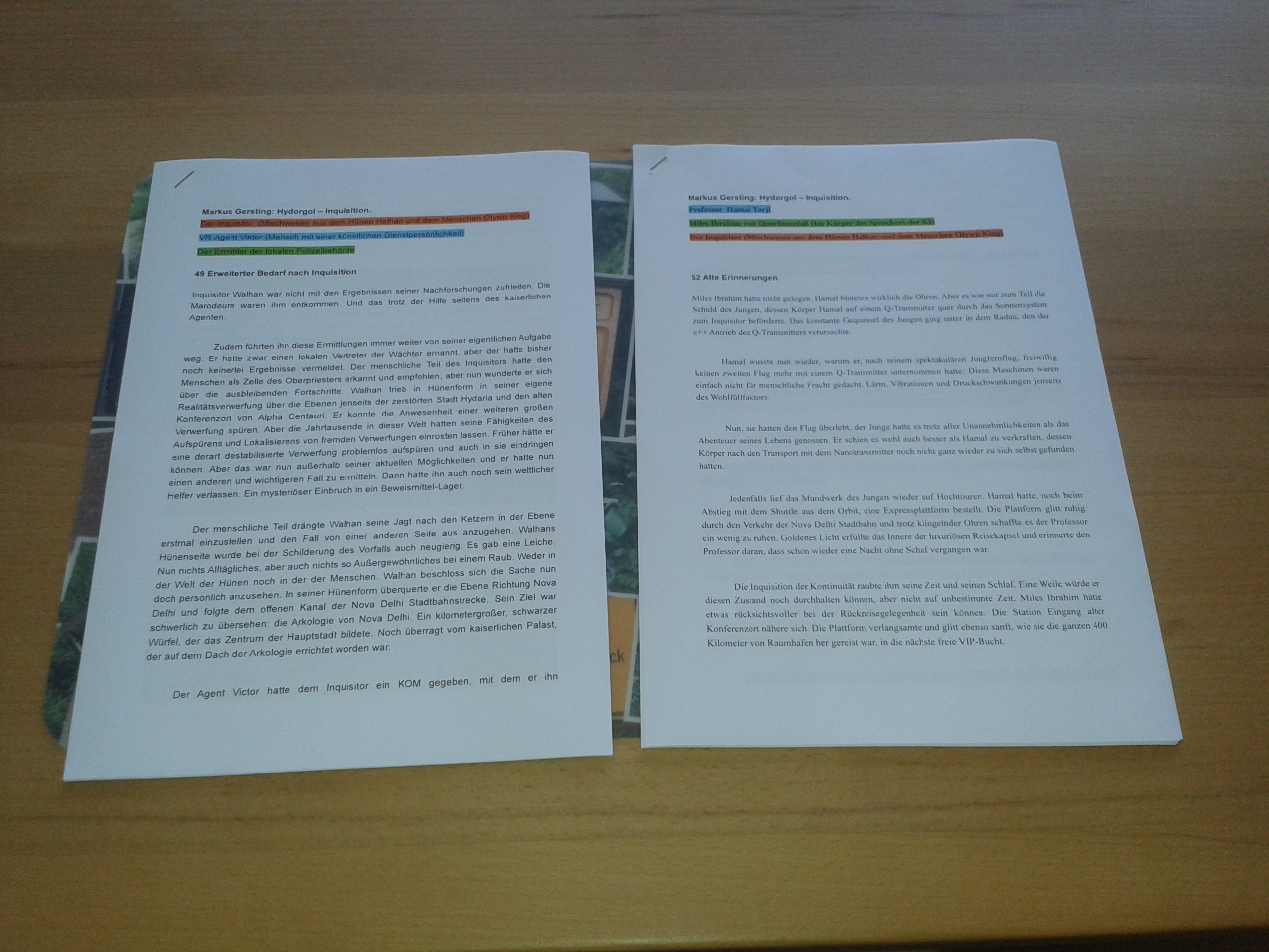 So und nun genug geschwärmt, ich muss mir langsam mal überlegen, ob es bei meiner Lesung Kapitel 49 oder Kapitel 52 aus „Hydorgol – Inquisition“ werden wird. Eine ganze Menge Kriterien waren zu berücksichtigen und die beiden Kandidaten haben es in die engere Auswahl geschafft. Wer die Wahl hat, hat die Qual …