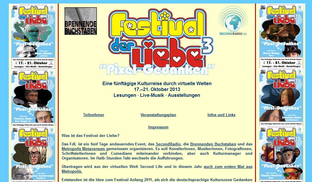 Nun nach einer ganzen Reihe von Events in SL wirft das FDL seine Schatten vorraus. Dieses Wochenende scheint ruhiger zu sein. Eine Stille in SL wie vor dem großen Sturm. Nun denn, noch ist etwas Zeit sich für den geballten Ansturm von Kunst und Kreativiät vom 17.–21. Oktober 2013 zu wappnen.