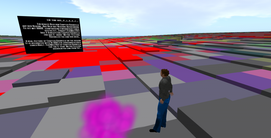 ChapTer Kronfeld: Ja, ich werde dem Thema des diesjährigen Festivals ‚Pixelgedanken‘, in den zwei virtuellen 3D Plattformen, SL und Metropolis, je eine weiträumige Kunstpräsentation widmen. Diese 3D Installationen werden sich in Größe und Interpretation,in den beiden Grid’s, unterscheiden. Inmitten der beiden künstlerischen Werke werde ich auch Lesungen, meiner Prosa und Lyrik, life in Voicetechnik, vortragen.