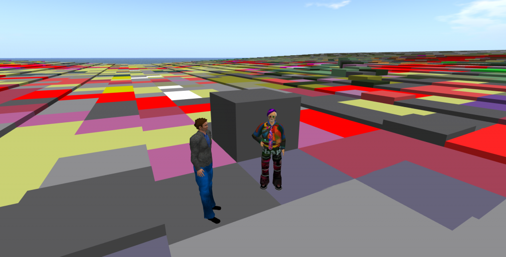 In SL findet dieses Gesamtwerk auf einer Dreiecksfläche in Größe einer sechstel Region statt, so lala zehntausend Quadratmeter. Es besteht aus einer Menge an Mauerstücken, den ‚Pixeln‘, die wie vom Himmelgefallen über- und durcheinander herumliegen und dennoch manchen Durchgang den Besuchern lassen. Bei Annäherungen an bestimmten Punkten, werden die wahren ‚Helden‘ der virtuellen Welt gerezzt. Es sind dies die minimalsten Elemente, die Pixel, ohne Textur, durchsichtig und nur zusammengehalten von geometrischen Linien (je in den drei Farben RGB), die die kleinsten Flächen andeuten.