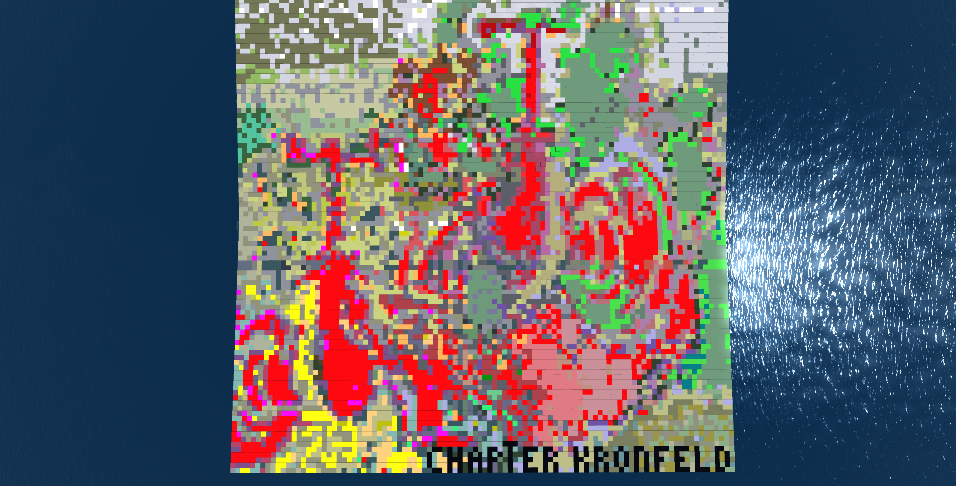 In Metropolis zeige ich eine komplette begehbare Region, Ca. 65000qm², auf der ich für eine andere Veranstaltung im Frühjahr dieses Jahres, zehntausend Würfel mit je einer Kantenlänge von 2,55m gebaut habe. Diese Hexaeder, als Pixel, liegen mathematisch exakt aneinander, in der Anordnung 100 x 100 Stück. Alle Kuben sind einfarbig coloriert. Nur aus der Vogelperspektive auf die gesamte Regionsfläche ergibt sich ein erkennbares gepixeltes Bild.