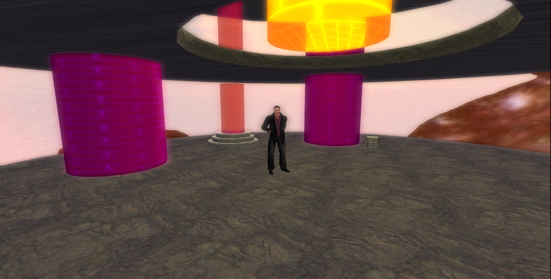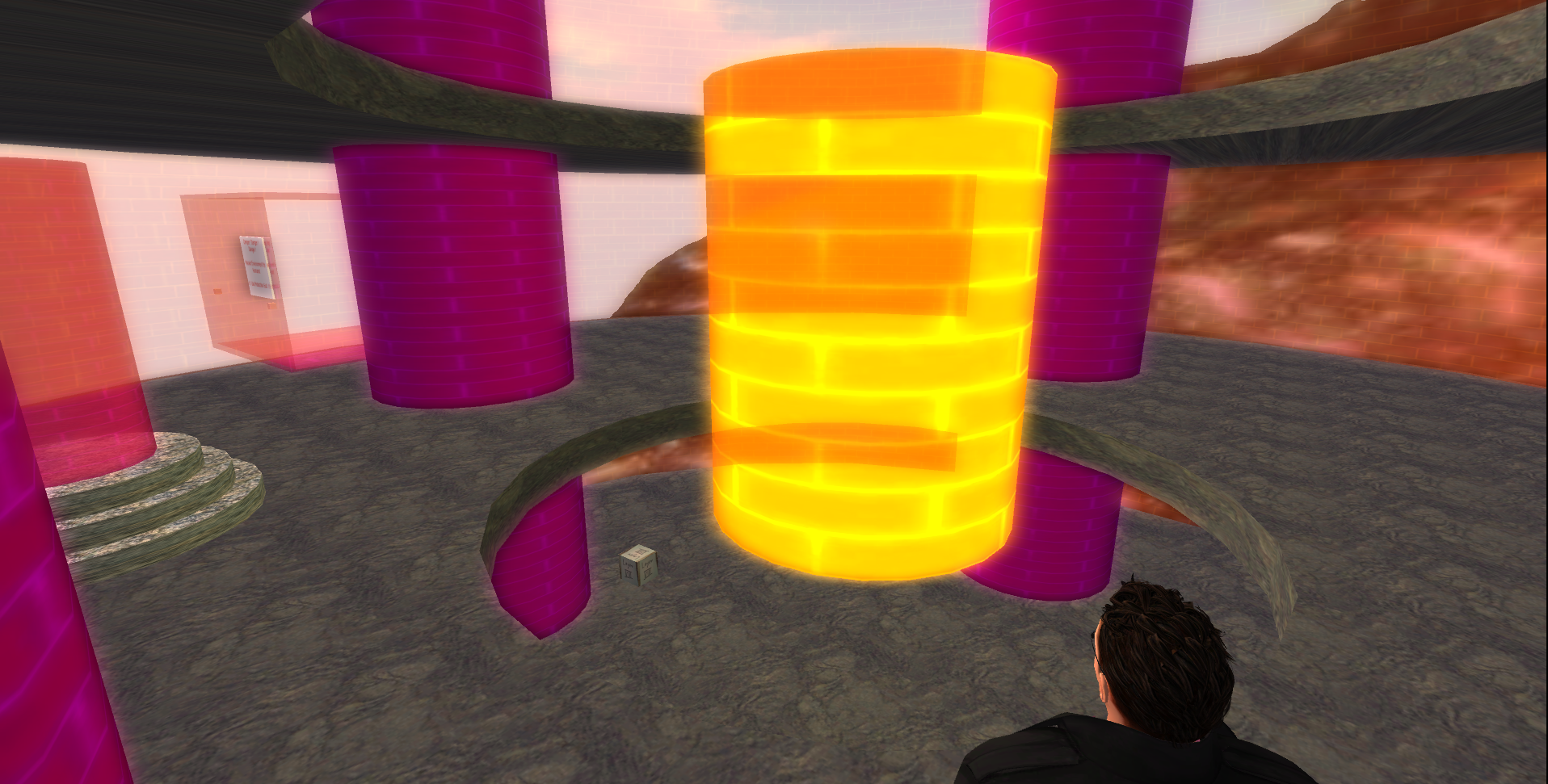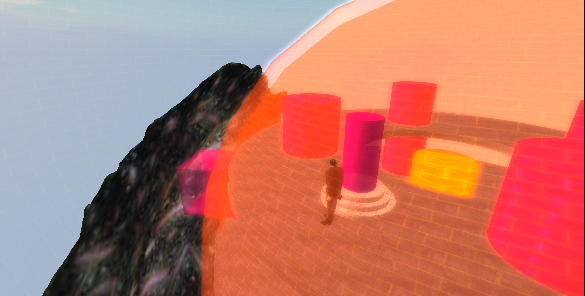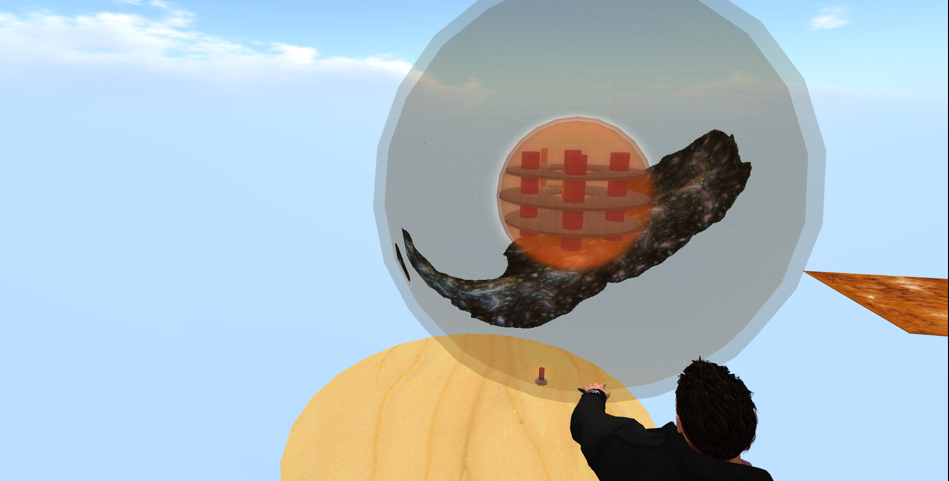 Hier ein paar Impressionen meiner ersten Bauversuche in SL. Zu finden in luftiger Höhe über dem Kreativdorf. Das Objekt stellt eine Sphäre der Hünen dar, mit der sich diese riesigen Gaswesen in die Welt der Menschen bewegen können. SL hat leider ein paar Restriktionen, aber ich hoffe es ist trotzdem anschaulich …